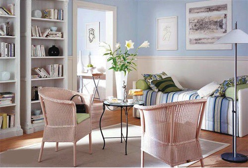 中性風(fēng)格搭配:天藍色牆漆+淺色藤椅+軟裝飾