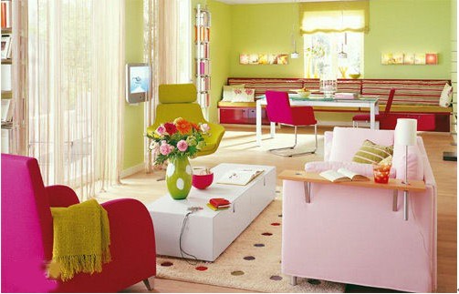 簡約清新風(fēng)格搭配:紫紅(hóng)座椅+粉紅(hóng)色沙發