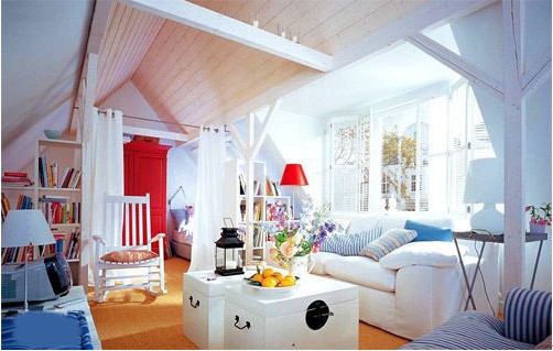 閣樓形式的空間設計(jì),木條式結構裝飾,别緻的木箱茶幾,藍與白(bái)的設色描繪出一片藍色的海洋,